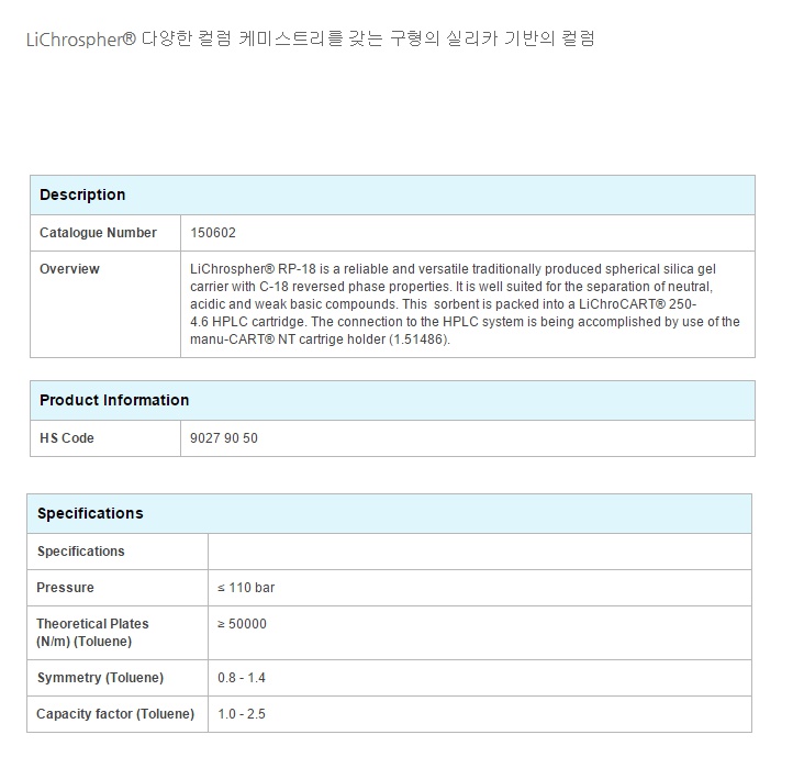 ½Ç¸®Ä« ±â¹Ý Ä÷³, LiChroCART 250-4.6 LiChrospher 100RP-18 5µm, 5µm, 250mm, 4.6mm, 1Unit [1.50602.0001]
