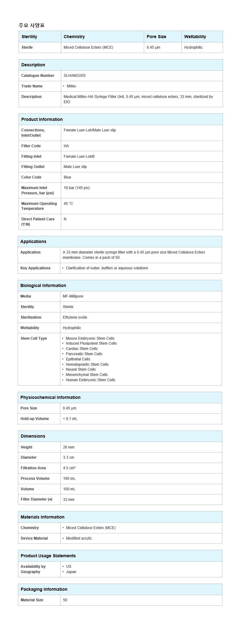 Á¦Ç°¸í »ùÇà Àüó¸® ÇÊÅÍ, [SLHAM33SS] ,Medical Millex-HA Syringe Filter Unit, MCE, sterilized by EtO, 0.45 µm, 33 mm
