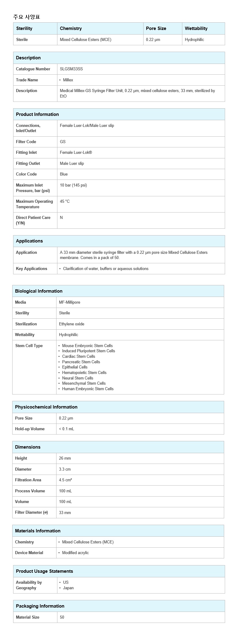 Á¦Ç°¸í »ùÇà Àüó¸® ÇÊÅÍ, [SLGSM33SS] ,Medical Millex-GS Syringe Filter Unit, MCE, sterilized by EtO, 0.22µm, 33mm, 50/pk