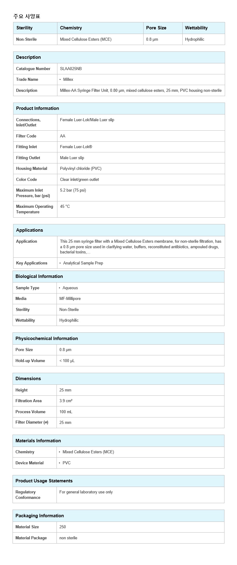 »ùÇà Àüó¸® ÇÊÅÍ, [SLAA025NB] ,Millex-AA Syringe Filter Unit, MCE, PVC housing non-sterile, 0.80 µm, 25 mm, 250/pk