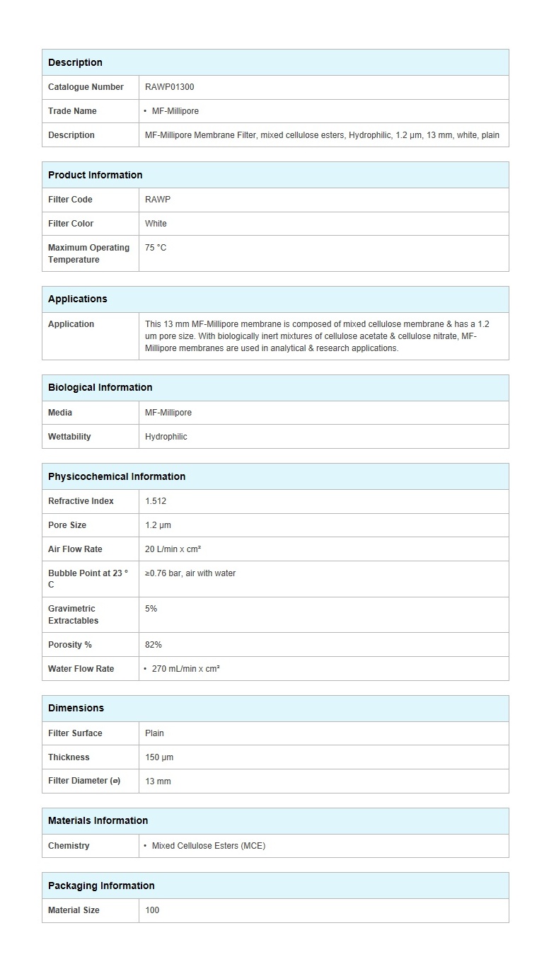 Á¦Ç°¸í »ùÇà Àüó¸® ÇÊÅÍ, [RAWP01300] ,MF-Millipore Membrane Filter, MCE, Hydrophilic, 1.2 µm, 13 mm, 100/pk
