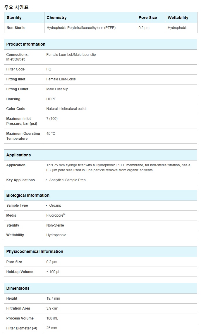 »ùÇà Àüó¸® ÇÊÅÍ, [SLFG025NS] ,Millex-FG, hydrophobic PTFE, non-sterile, 0.20 µm, 25 mm, 50/pk