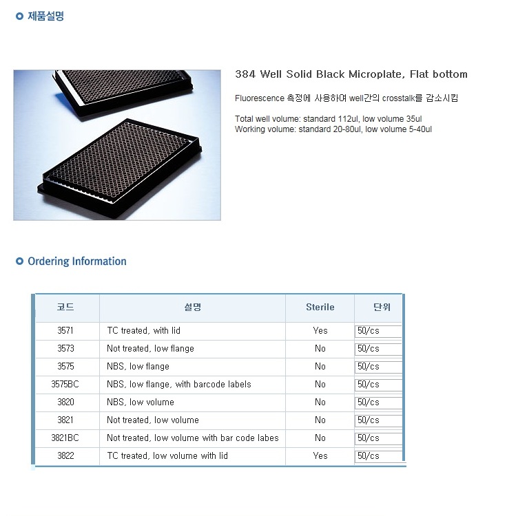 Á¦Ç°¸í ¼¼Æ÷¹è¾çÇ÷¹ÀÌÆ® , 384well , PCR Ç÷¹ÀÌÆ® ,¼Ö¸®µå ºí·¢ ¸¶ÀÌÅ©·Î Ç÷¹ÀÌÆ®, Solid Black Microplate, Flat bottom 3571