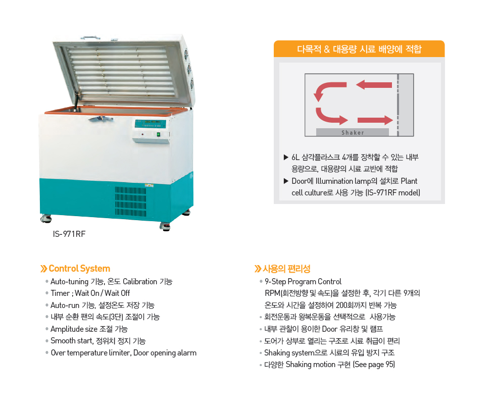 ===Á¦Ç° Ư¡=== ´ë¿ë·®ÀÇ ½Ã·á ±³¹Ý¿¡ ÀûÇÕÇÑ ´ëÇü ÁøÅÁ ¹è¾ç±â, Plant cell cultureµµ °¡´ÉÇÑ ¸ðµ¨À» °®Ãá Floor type Shaking Incubator