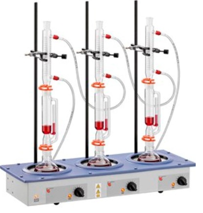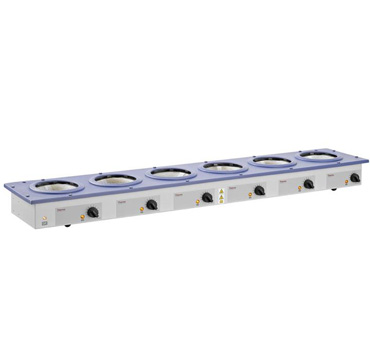 The Multi (Extraction) Mantle with six recesses has a built-in electronic controller and offers a choice of heater only (EME6) or heater/stirrer (EMEA6) combination models. They may be used with the FM110 Flow Monitor.